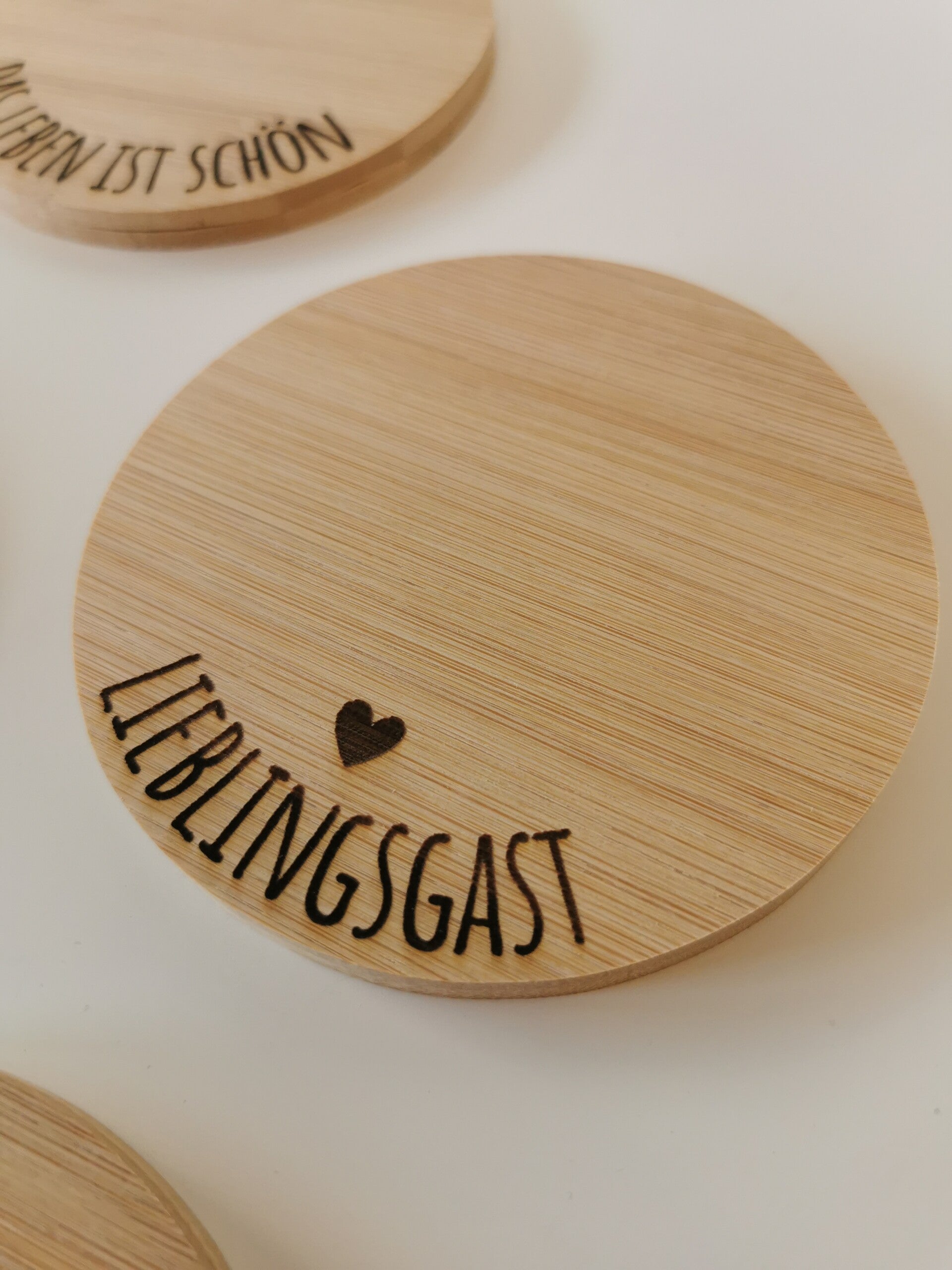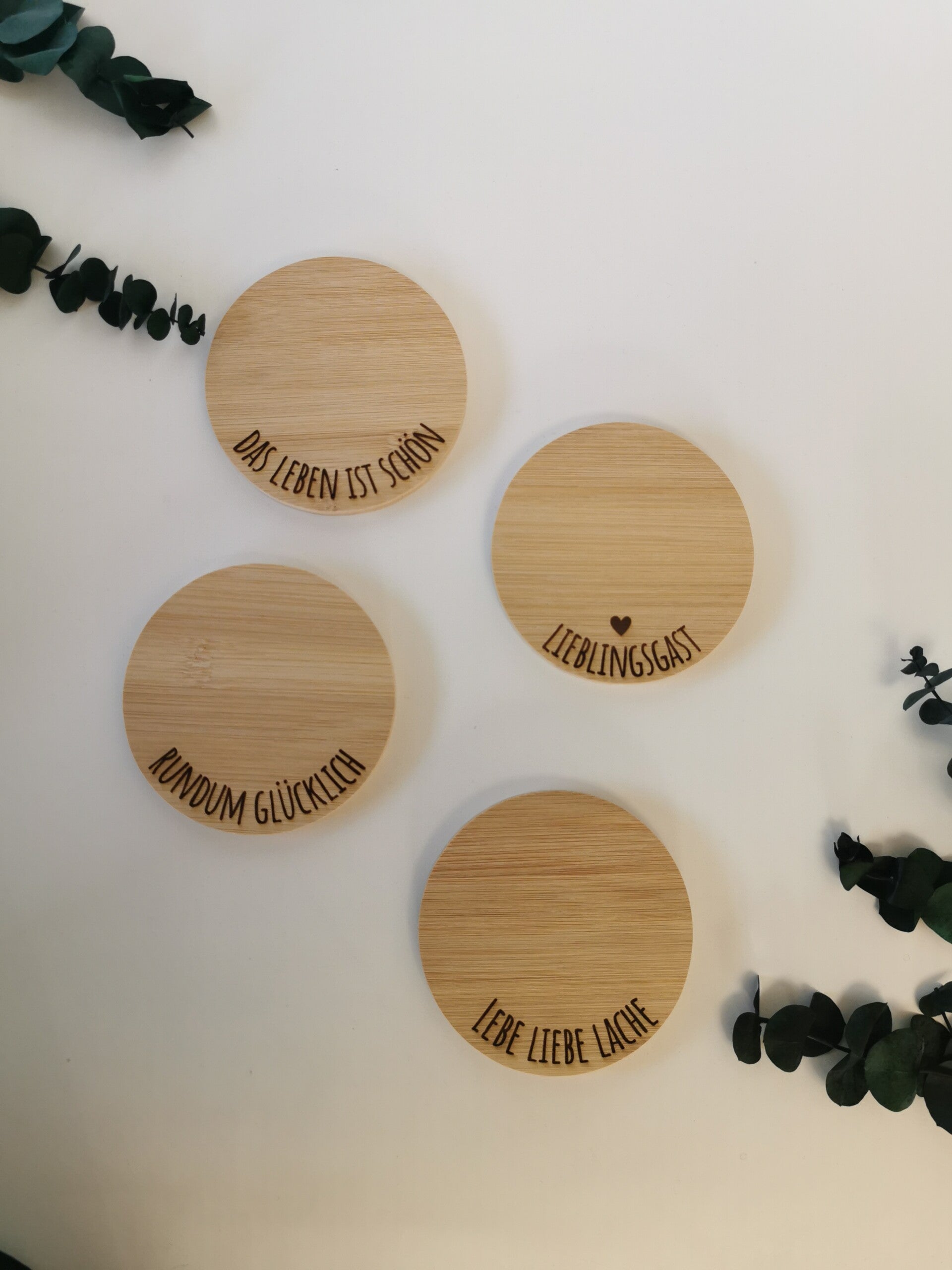 Ein Set bestehend aus 4 Untersetzern mit verschiedenen Aufschriften