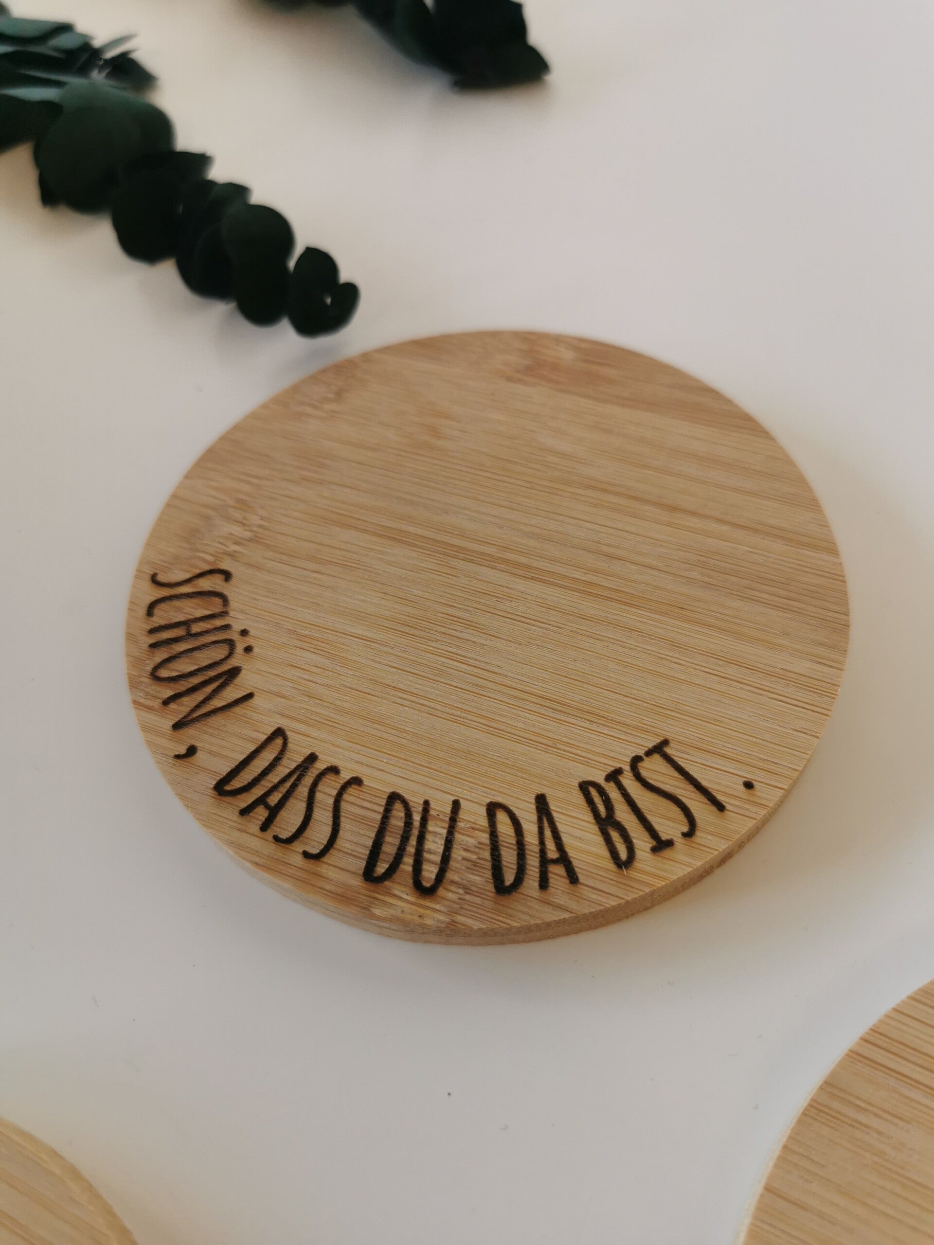Ein Set bestehend aus 4 Untersetzern mit verschiedenen Aufschriften